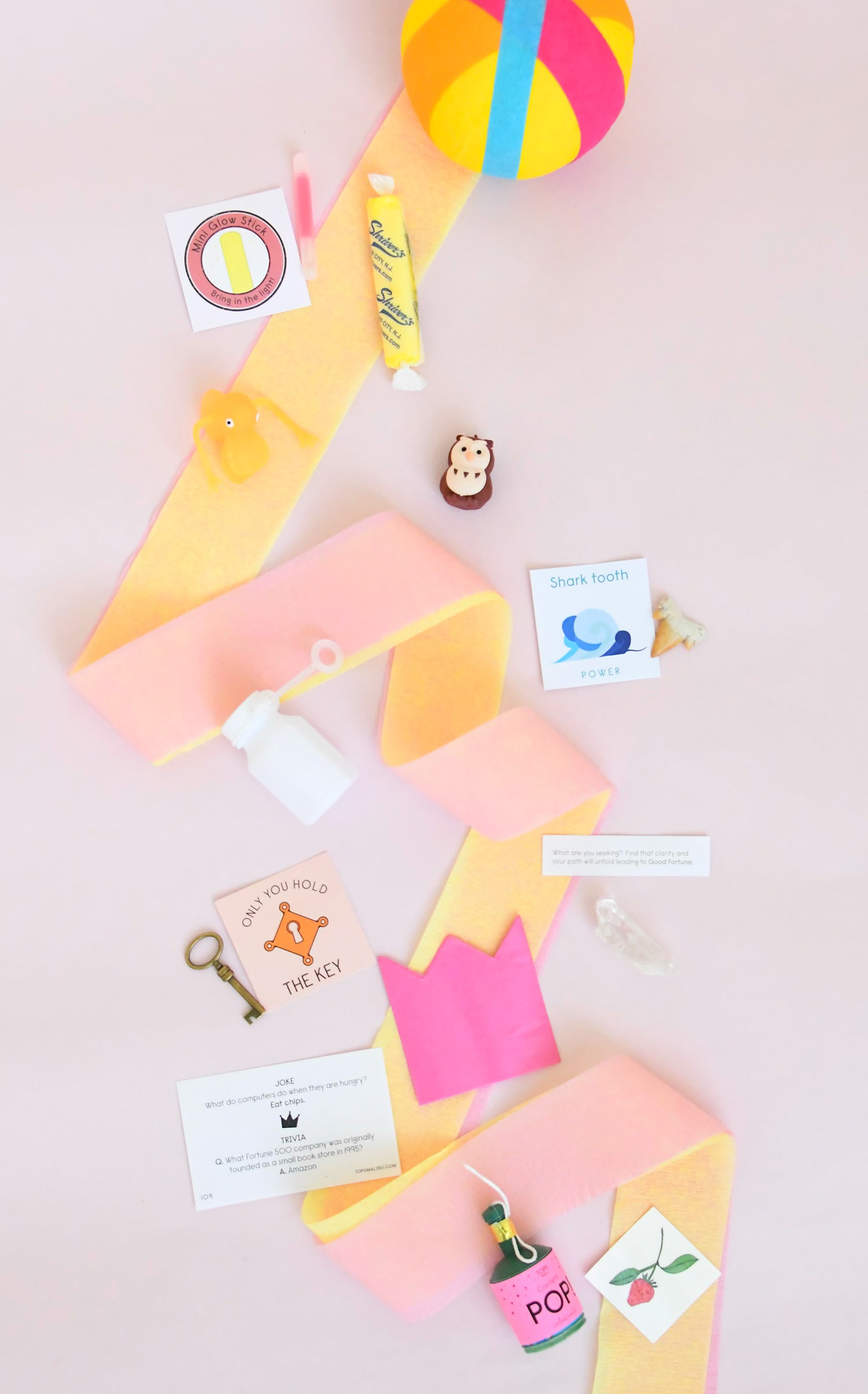 Unwind a Surprise Ball. Carefully peel the layers of colorful crepe paper ribbon & feel the excitement build with each new layer. The element of surprise makes it so much fun, discovering each treasure that awaits you. Find small trinkets, vintage-inspired toys and maybe even a sweet tucked inside. Take your time and savor the moments of opening each gift before reaching your final prize in the center. Contains: 12 prizes in a Deluxe Ball & 6 prizes in a Mini Ball